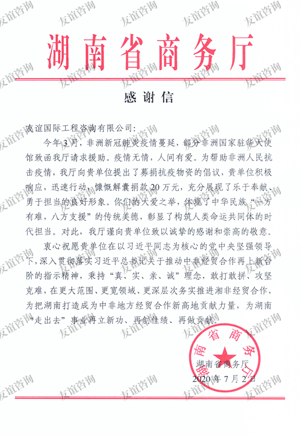 • 湖南省商務(wù)廳感謝信